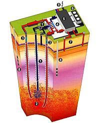 Das Grundmodell eines geothermischen Kraftwerks: Im heißen, mehr als 4000 Meter tiefen Gestein werden Risse und Klüfte hydraulisch aufgeweitet. Durch sie fließt von der Oberfläche eingebrachtes Wasser, das sich in der Tiefe erhitzt, über eine weitere Bohrung zurückgefördert wird und im oberirdischen Kraftwerk eine Turbine zur Stromerzeugung antreibt. Anschließend wird es über die erste Bohrung wieder in den Untergrund gepresst. Notwendig sind zwei Bohrungen mit einer kaum vorstellbaren Tiefe.